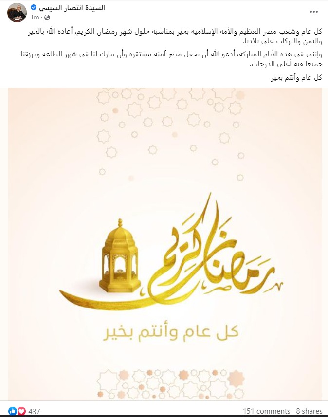 وجاء نص تهنئة قرينة الرئيس عبد الفتاح السيسي، على صفحتها الرسمية بموقع التواصل الاجتماعي فيسبوك: كل عام وشعب مصر العظيم والأمة الإسلامية بخير بمناسبة حلول شهر رمضان الكريم، أعاده الله بالخير واليمن والبركات على بلادنا.