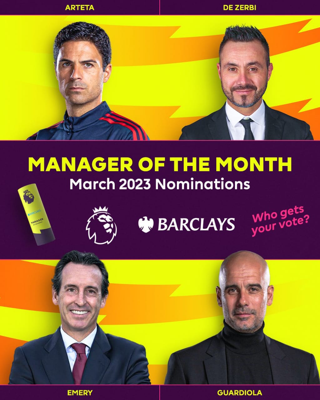وشهدت قائمة المرشحين لحصد جائزة أفضل مدرب في الدوري الإنجليزي الممتاز عن شهر مارس الجاري، تواجد الإسباني بيب جوارديولا المدير الفني لفريق مانشستر سيتي، وكذلك ميكيل أرتيتا مدرب أرسنال.