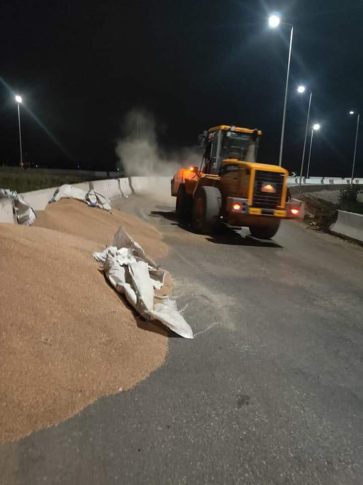 وانتقل ضباط وحدة مباحث المركز بقيادة المقدم أحمد توفيق، رئيس المباحث، والأجهزة التنفيذية لمكان البلاغ، وتبين أن السيارة تحمل لوحات معدنية رقم "د ج م 6349"، وانقلبت أثناء دخولها دوران كوبري شرنقاش، نتيجة اختلال عجلة القيادة في يد السائق، ما أسفر عن سقوط الحمولة المقدرة بحوالي 60 طن قمح على الطريق، وجرى تحرير المحضر اللازم بالواقعة.