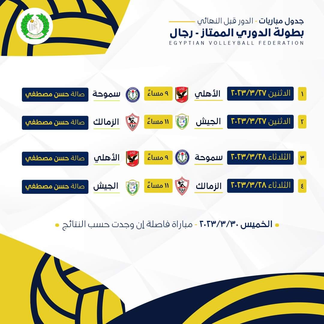 أعلن الاتحاد المصري للكرة الطائرة، جدول مباريات الدور قبل النهائي من مسابقة الدوري، بمشاركة 8 فرق، والمقرر انطلاقه يوم الاثنين المقبل، بعد تعديل جدول منافسات البطولة.