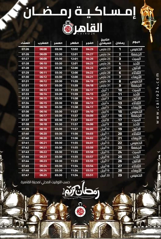 ويوضح القاهرة 24 مواقيت الصلاة في اليوم الثالث من رمضان 2023 في مصر: