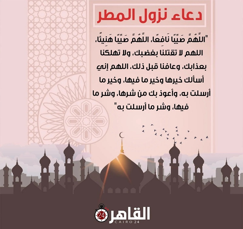 وأوصانا رسولنا الكريم صلى الله عليه وسلم بقول الدعاء عند نزول المطر، وحرصًا من القاهرة 24 على تقديم أخر الأخبار والخدمات للمواطنين، سنقدم لكم فيما يلي دعاء المطر قصير ومستجاب، بالإضافة إلى دعاء الرعد والبرق.