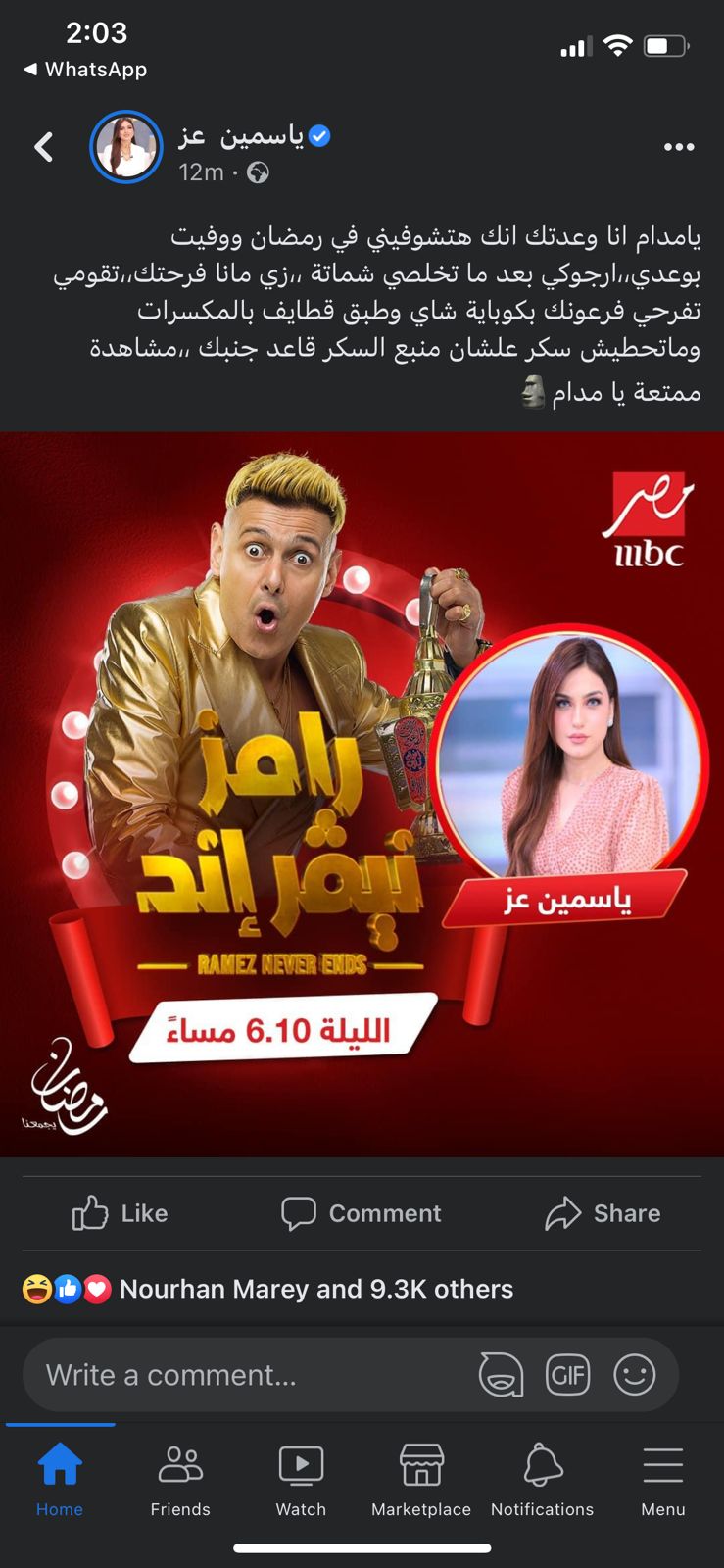 وقالت ياسمين عز في منشور عبر صفحتها الرسمية بموقع فيس بوك: يا مدام أنا وعدتك إنك هتشوفيني في رمضان ووفيت بوعدي، أرجوكي بعد ما تخلصي شماتة، زي ما أنا فرحتك، تقومي تفرحي فرعونك بكوباية شاي، وطبق قطايف بالمكسرات، وماتحطيش سكر علشان منبع السكر قاعد جنبك، مشاهدة ممتعة يا مدام.