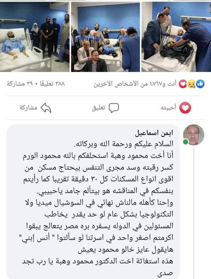 وكتبت أخت الباحث محمود وهبة في تعليقها: السلام عليكم ورحمة الله وبركاته أنا أخت محمود وهبة أستحلفكم بالله محمود الورم كسر رقبته وسد مجرى التنفس بيحتاج مسكن من أقوی أنواع المسكنات كل 30 دقيقة تقريبًا كما رأيتم بنفسكم في المناقشة هو بيتألم جامد يا حبيبي.