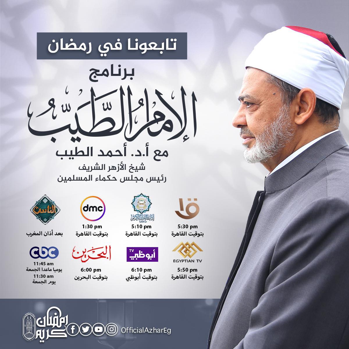 وجاءت مواعيد بث برنامج الإمام الأكبر الدكتور أحمد الطيب، شيخ الأزهر الشريف، ورئيس مجلس حكماء المسلمين كالتالي: