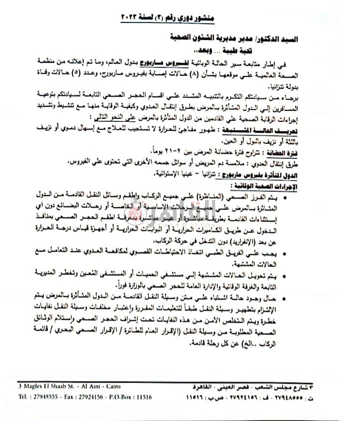 وأوضحت وزارة الصحة والسكان، في خطاب لها حصل القاهرة 24 على نسخة منه، أنه يجب على أقسام الحجر الصحي بتوعية المسافرين إلى الدول المتأثرة بمرض ماربورغ، بطرق انتقال العدوى وكيفية الوقاية منها.