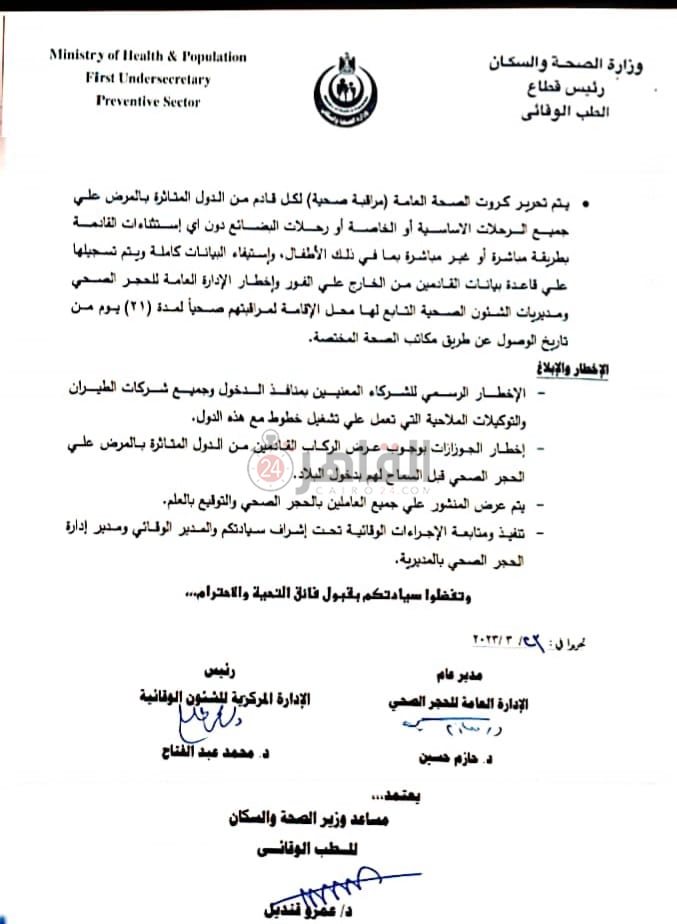وأكد قطاع الطب الوقائي، على الفريق الطبي باتخاذ الاحتياطات القصوى لمكافحة العدوى عند التعامل مع الحالات المشتبهة، وتحويلها إلى مستشفى الحميات أو المستشفى المعيّن مع إخطار المديرية التابعة والغرفة الوقائية والإدارة العامة للحجر الصحي بالوزارة فورا.