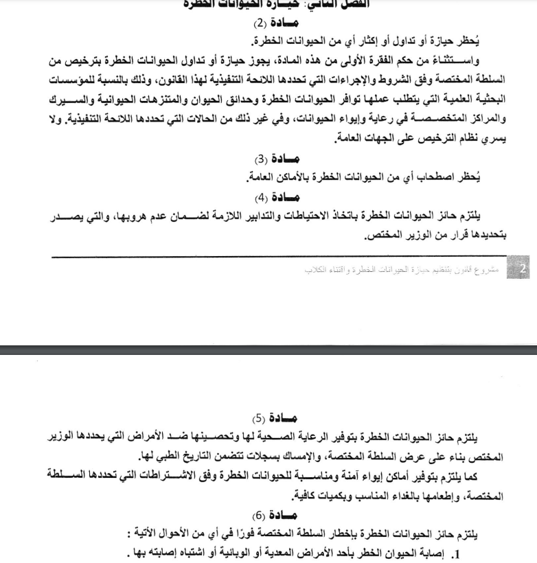 تناقش لجنة الزراعة والري في مجلس النواب الثلاثاء المقبل، مشروع قانون بإصدار قانون تنظيم حيازة الحيوانات الخطرة واقتناء الكلاب والمقدم من النائب أحمد السجيني و60 عضوًا في المجلس.