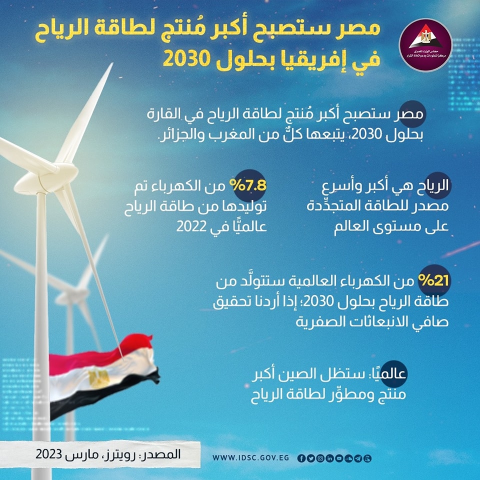 وأكد مركز المعلومات من خلال منشور له عبر صفحته الرسمية على “فيس بوك”، أن مصر ستصبح أكبر منتج لطاقة الرياح في القارة بحلول 2030، يتبعها كلٌّ من المغرب والجزائر، كما ستظل الصين أكبر منتج ومطوِّر لطاقة الرياح عالميًّا.