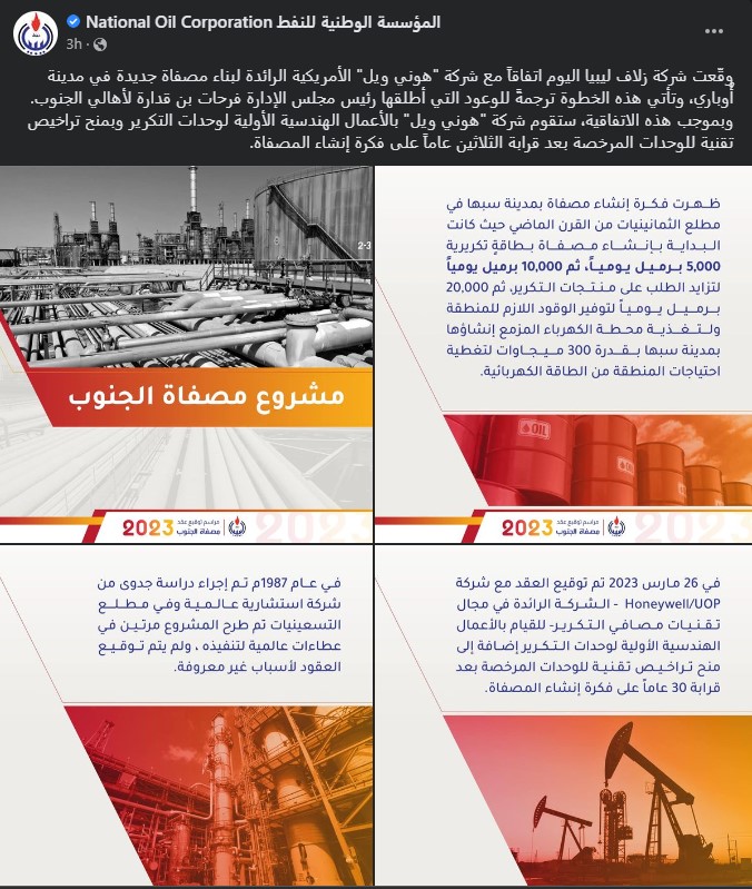 أعلنت المؤسسة الليبية الوطنية للنفط، توقيع شركة زلاف إحدى شركات المؤسسة، عقدًا مع شركة هانيويل ومقرها الولايات المتحدة الأمريكية، لتنفيذ أعمال هندسية في مشروع مصفاة الجنوب بتكلفة تتراوح بين 500 مليون دولار و600 مليون دولار.