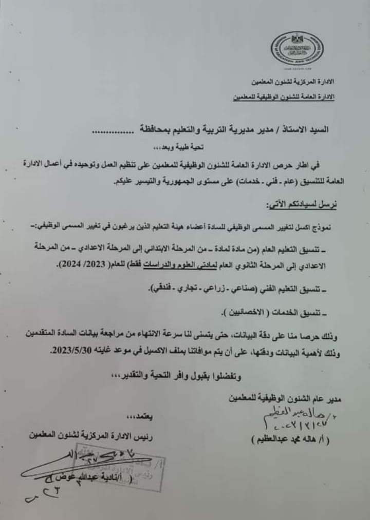وقالت الوزارة في خطابها، إنه في إطار حرص الإدارة العامة للشؤون الوظيفية للمعلمين على تنظيم العمل وتوحيده في أعمال الإدارة العامة للتنسيق عام - فني - خدمات على مستوى الجمهورية والتيسير عليكم، يوجد نموذج اكسل لتغيير المسمى الوظيفي لأعضاء هيئة التعليم الذين يرغبون في تغيير المسمى الوظيفي.