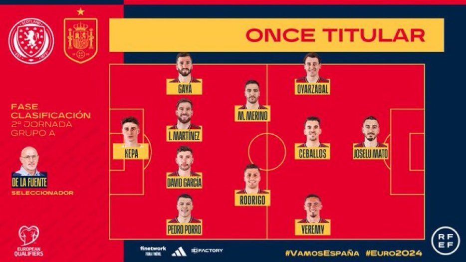 وسيبدأ منتخب إسبانيا مباراته ضد إسكتلندا اليوم في تصفيات بطولة يورو 2024 بتشكيل مكون من:
