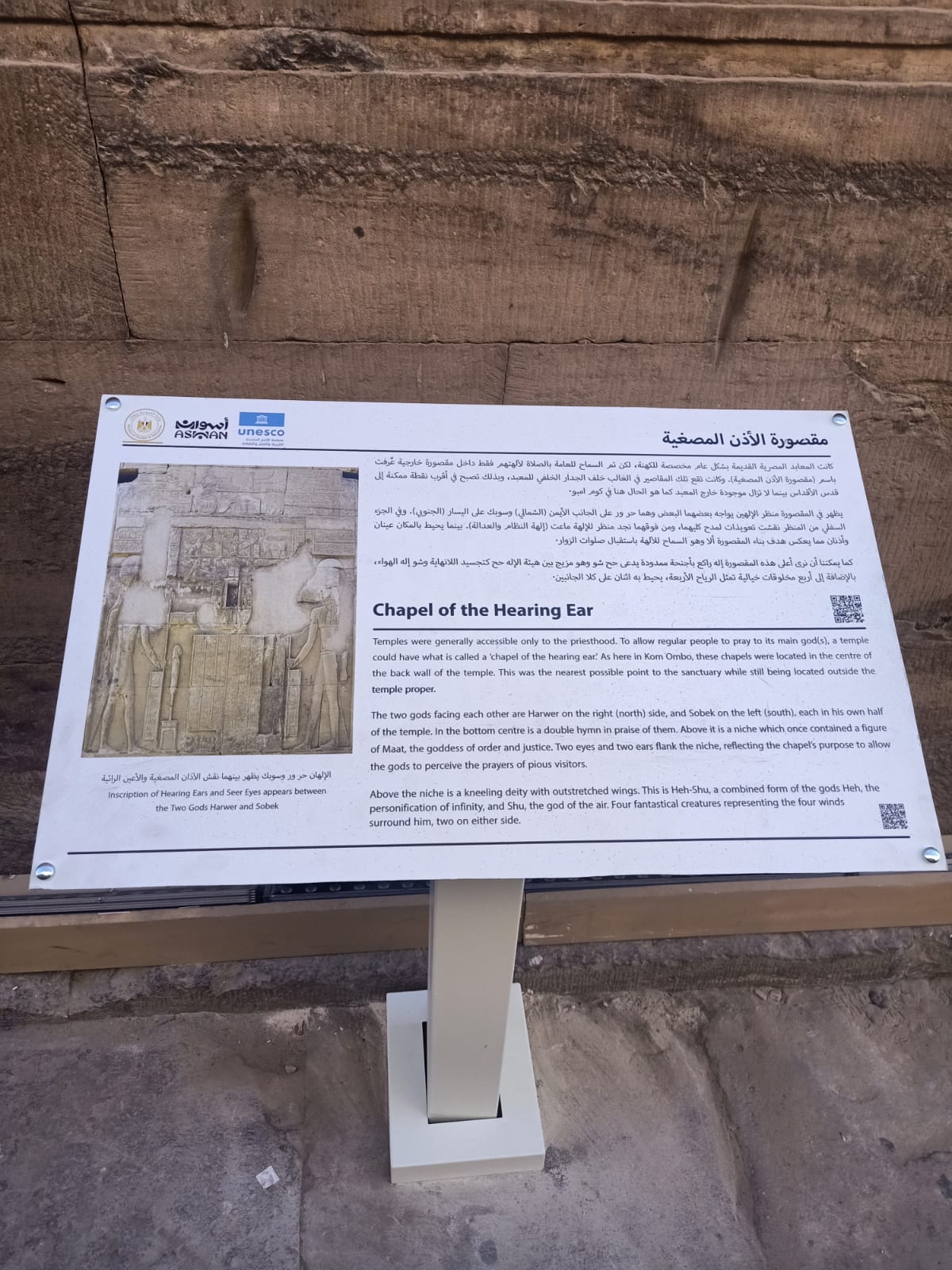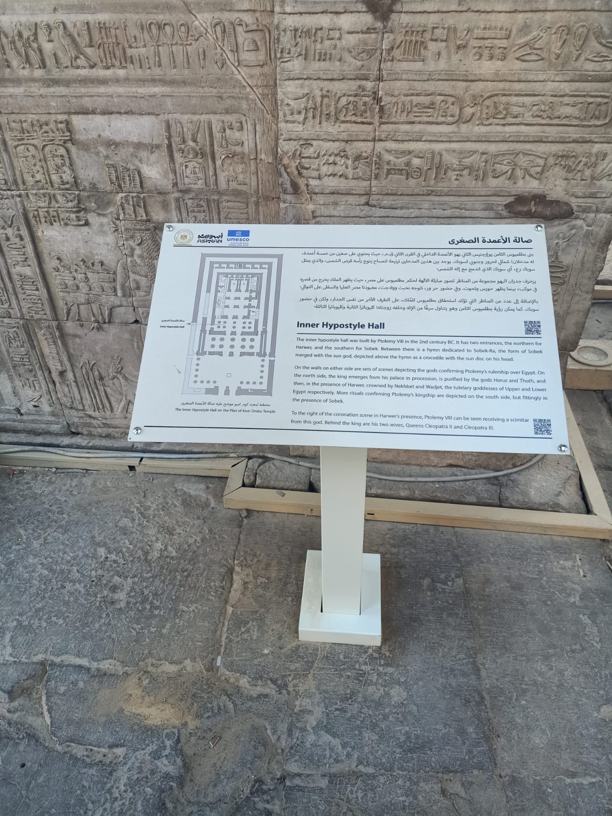 وأضاف الدكتور باسم إبراهيم، أنه في إطار أعمال تطوير معبد كوم أمبو بأسوان تم تزويد الموقع بعدد 13 لوحة معلوماتيه مزوده بالرمز الكودي (QR) والتي تشرح تاريخ وعمارة الموقع باللغتين العربية والإنجليزية، وقد تم تزويد اللوحات بصور ومخططات وروسومات توضيحية لكافة العناصر المعمارية والنقوش الموجودة بالمعبد والتي تشمل بوابة وصرح المعبد والفناء المفتوح وصالتي الأعمدة الكبرى والصغرى، وقدسي الأقداس وبيت الولادة (الماميزي) ومقصورة حتحور والمجموعة المائية.