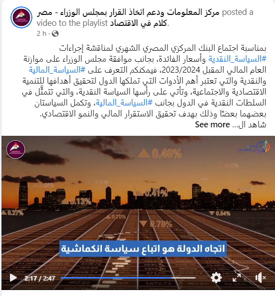 وبشأن سعر الفائدة واجتماع البنك المركزي، نشر مركز معلومات الوزراء فيديو جراف عبر صفحته الرسمية على فيسبوك، يوضح أنه يتم اللجوء إلى أدوات السياسة الانكماشية مثل قيام البنك المركزي، برفع معدلات الفائدة لتشجيع الأفراد على الادخار، أو رفع نسبة الاحتياطي الإلزامي للحد من قدرة البنوك على الإقراض.