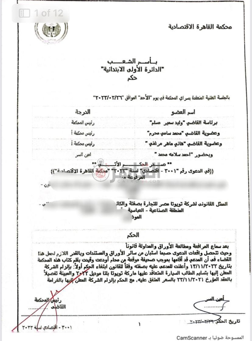 المحكمة الاقتصادية تلزم تويوتا مصر بدفع تعويض مادي لأحد الحاجزين