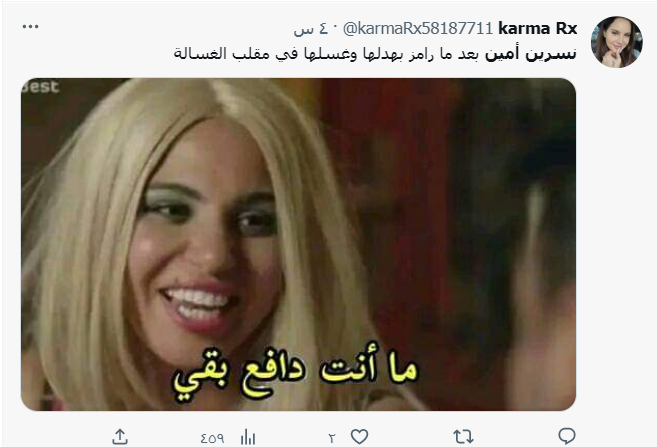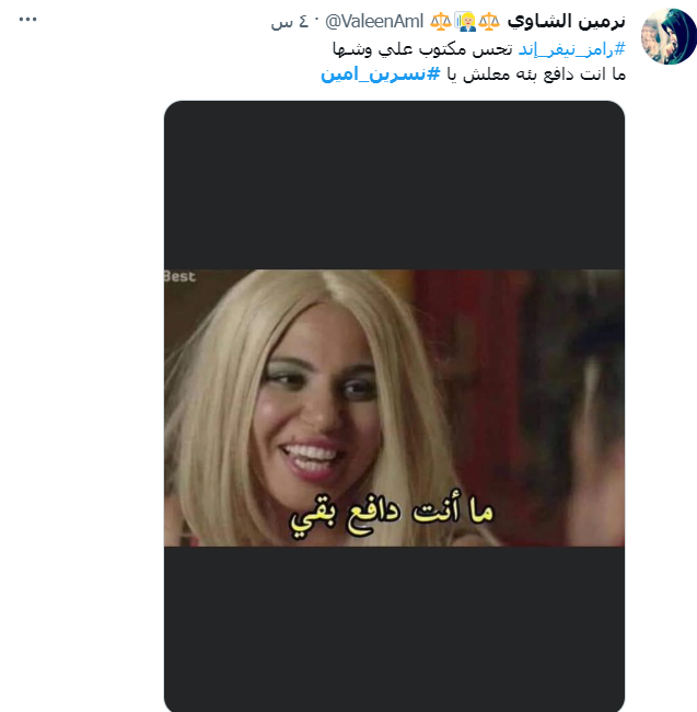 تصدرت الفنانة نسرين أمين تريند تويتر، بعد حلقتها مع رامز جلال في برنامج رامز نيفر إند، إذ تداول مستخدمو تويتر مشاهد ولقطات من الحلقة، إلى جانب مجموعة من الكومنتات الساخرة.