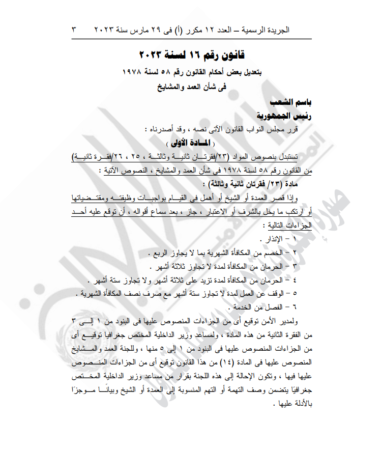 ونص القرار على أنه تستبدل بنصوص المواد (23/ فقرتان ثانية وثالثة، 25، 26 فقرة ثانية) من القانون رقم 58 لسنة 1978 في شأن العمد والمشايخ، النصوص الآتية:
