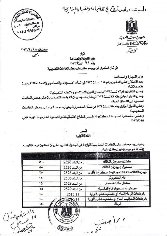 قرر وزير التجارة والصناعة أحمد سمير، مدّ فرض رسوم على بعض الخامات التعدينية، التي تدخل في عدة صناعات وتستوردها الدول الصناعية الأوروبية وفي آسيا من مصر.