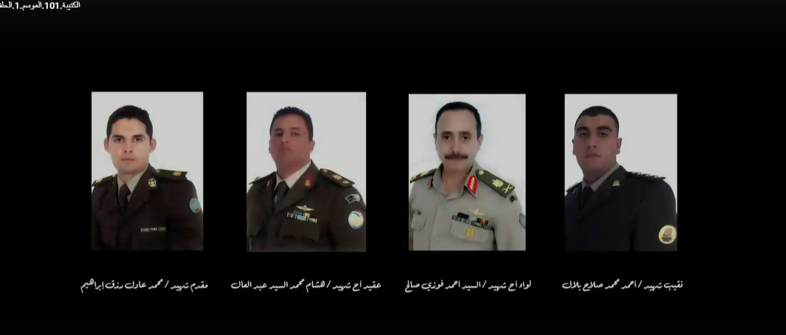 وعرضت الحلقة صور الضباط شهداء التفجير الإرهابي، وضمت الصور لـ النقيب شهيد أحمد محمد صلاح بلال، واللواء شهيد السيد أحمد فوزي صالح، والعقيد أ.ح هشام محمد السيد عبد العال، والمقدم شهيد محمد عادل رزق إبراهيم.
