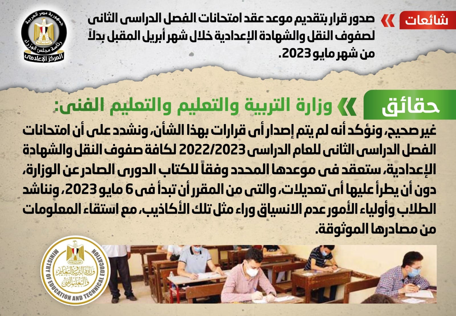 وتواصل المركز الإعلامي لـمجلس الوزراء مع وزارة التربية والتعليم والتعليم الفني، والتي نفت تلك الأنباء، مُؤكدة أنه لا صحة لتقديم موعد عقد امتحانات الفصل الدراسي الثاني لصفوف النقل والشهادة الإعدادية خلال شهر أبريل المقبل بدلا من شهر مايو 2023، وأنه لم يتم إصدار أي قرارات بهذا الشأن.