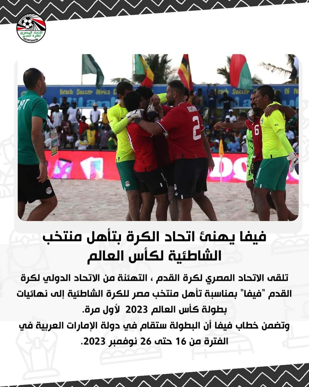 تلقى الاتحاد المصري لكرة القدم، التهنئة من الاتحاد الدولي لكرة القدم فيفا بمناسبة تأهل منتخب مصر للكرة الشاطئية إلى نهائيات بطولة كأس العالم 2023 لأول مرة.