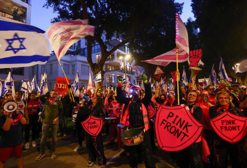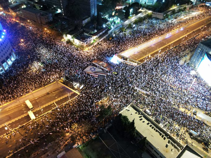 تشهد تل أبيب، احتجاجات عارمة، ضد خطة "التعديلات" القضائية، حيث أوضحت الصحف العبرية أن عدد المتظاهرين يحملون العلمين الإسرائيلي والأمريكي.