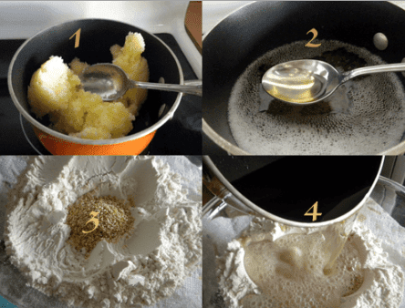 الخطوة الرابعة: أضيفي السمنة الساخنة جدا بعد غليانها على النار دون أن يتغير لونها إلى خليط الدقيق وباقي المكونات الجافة في العجان، وستلاحظين حدوث فوران لا تقلقي فهو أمر طبيعي وينتج عنه تحميص الدقيق.