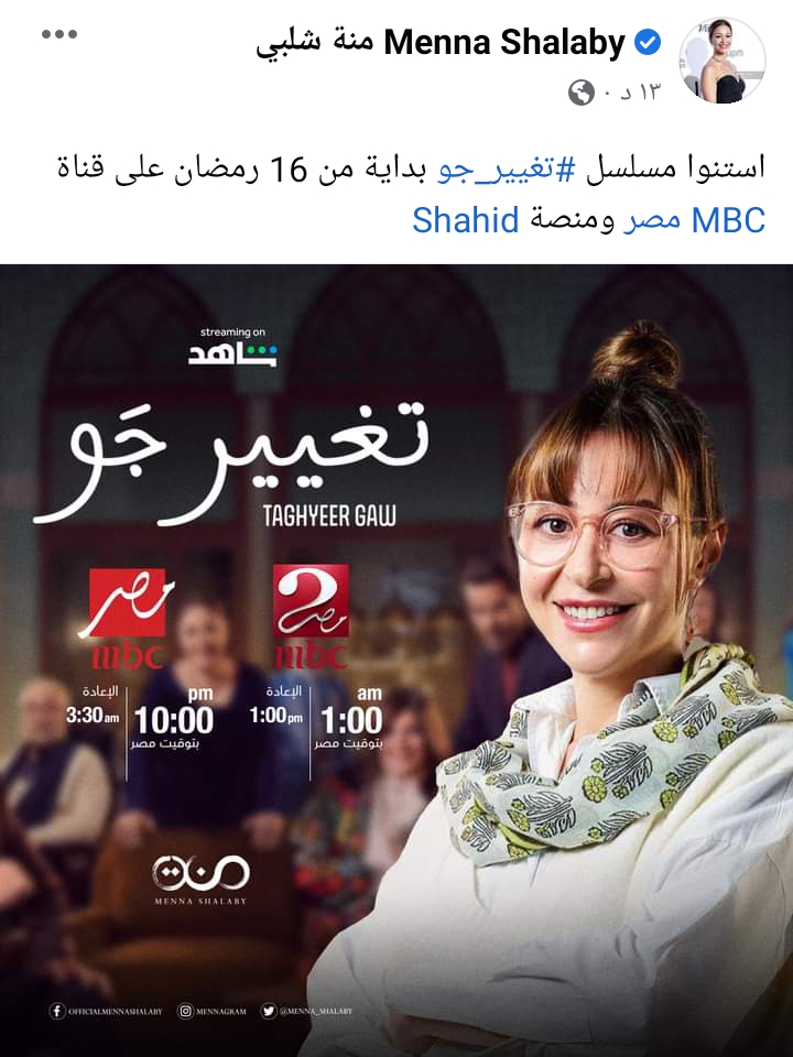 ونشرت منة شلبي، بوستر مسلسل تغيير جو، الذي يحمل صورتها، عبر حسابها الشخصي بموقع فيسبوك، وعلقت عليه قائلة: استنوا مسلسل تغيير جو بداية من 16 رمضان على قناة MBC مصر ومنصة Shahid.