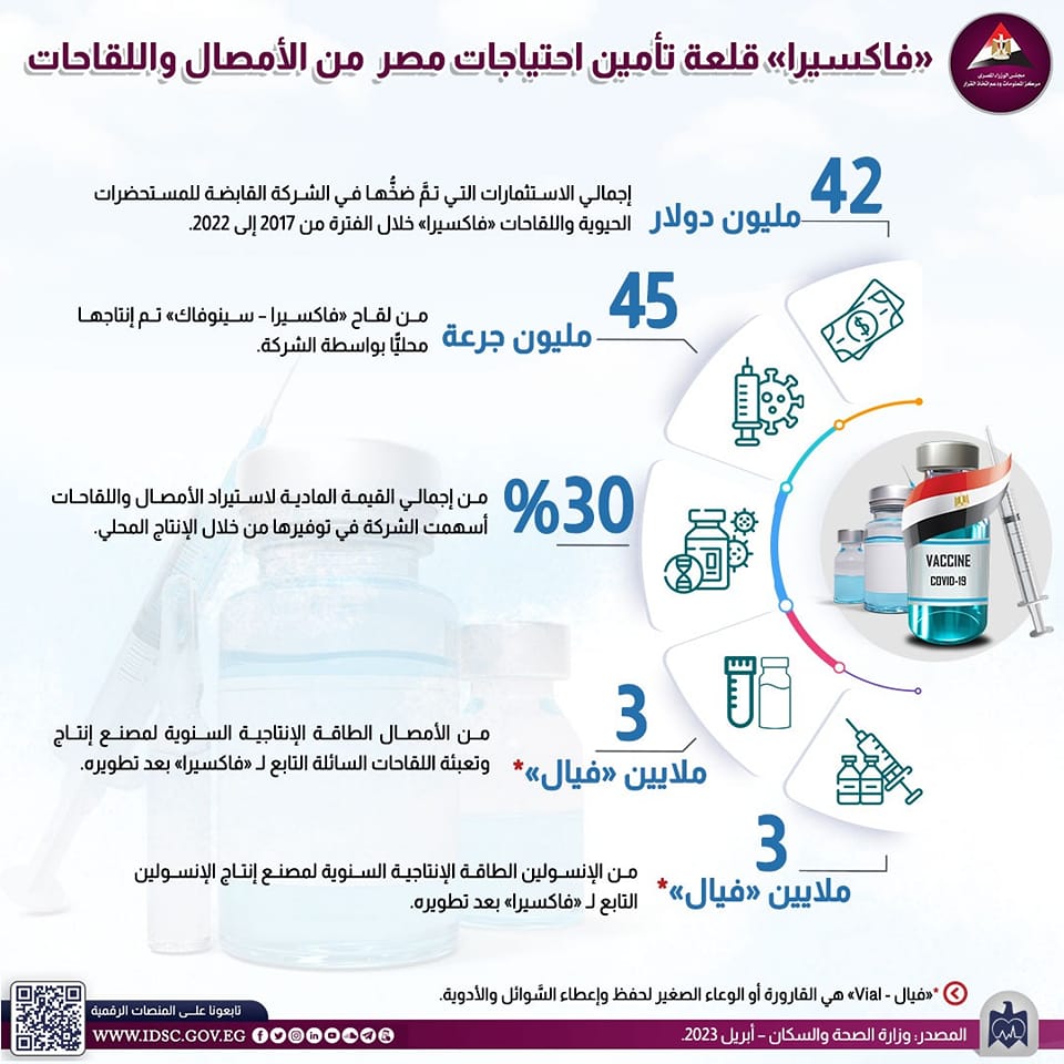 وأشار التقرير إلى أن مصر كثفت جهودها لتسخير ما لديها من إمكانات وبنًى تحتية في هذا المجال، وعلى رأسها الشركة القابضة للمستحضرات الحيوية واللقاحات فاكسيرا، وذلك إيمانًا بأهميتها ودورها الحيوي والريادي في مجال صناعة الأمصال واللقاحات، حيث أسهمت في تحقيق خطة الدولة لتوطين صناعة اللقاحات عبر إنشاء مجمع فاكسيرا الصناعي بمدينة 6 أكتوبر، ونجحت فاكسيرا خلال فترة وجيزة في إنتاج 45 مليون جرعة من لقاح فاكسيرا – سينوفاك مما كان له أثر واضح في تأمين احتياجات مصر من اللقاحات.