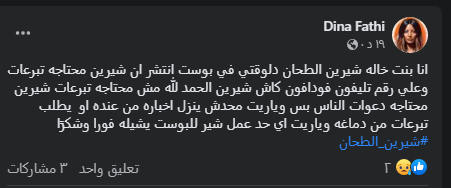 ووجهت بنت خالة شيرين الطحان رسالة عبر حسابها الشخصي بموقع التواصل الاجتماعي فيس بوك، قائلة: أنا بنت خالة شيرين الطحان دلوقتي في بوست انتشر أن شيرين محتاجة تبرعات وعلى رقم تليفون فودافون كاش.