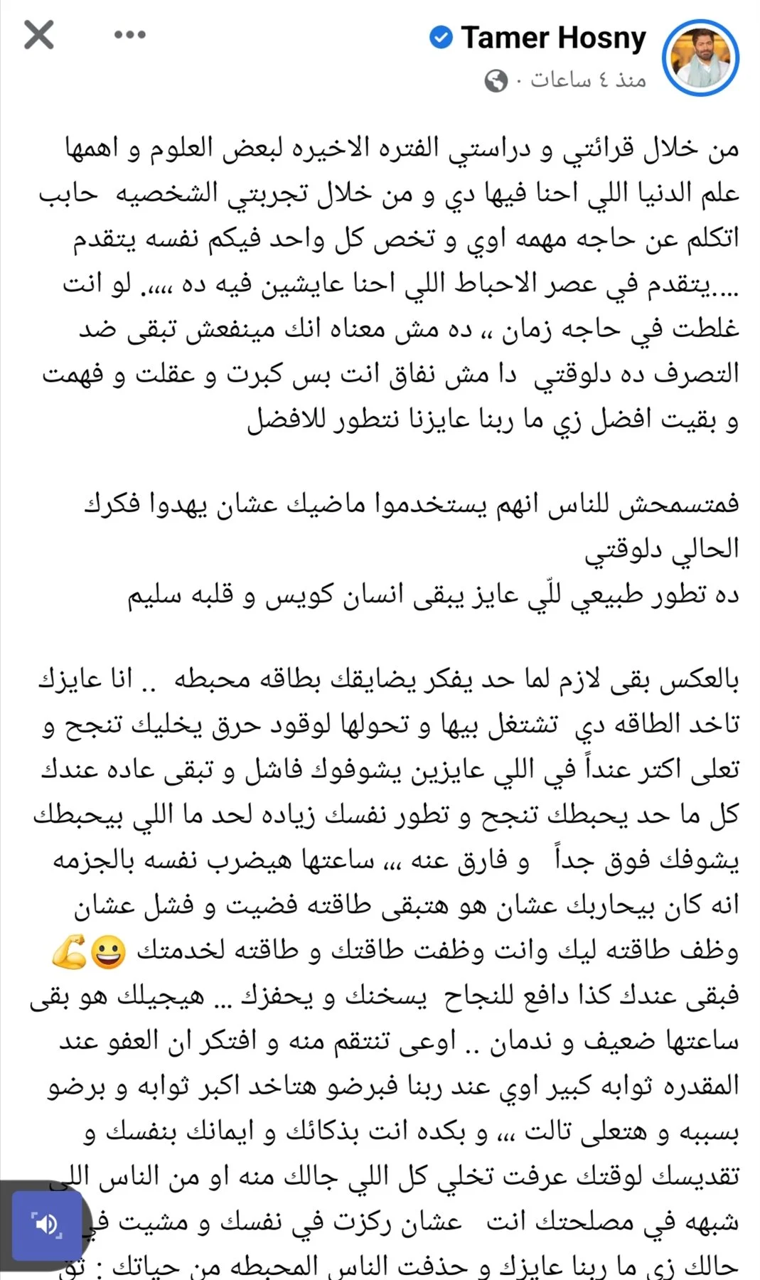 وأضاف تامر حسني في منشوره: متسمحش للناس إنهم يستخدموا ماضيك عشان يهدوا فكرك الحالي دلوقتي، ولو أنت غلطت في حاجة زمان، ده مش معناه إنك مينفعش تبقى ضد التصرف ده دلوقتي، دا مش نفاق أنت بس كبرت وعقلت وفهمت وبقيت أفضل زي ما ربنا عايزنا نتطور للأفضل.