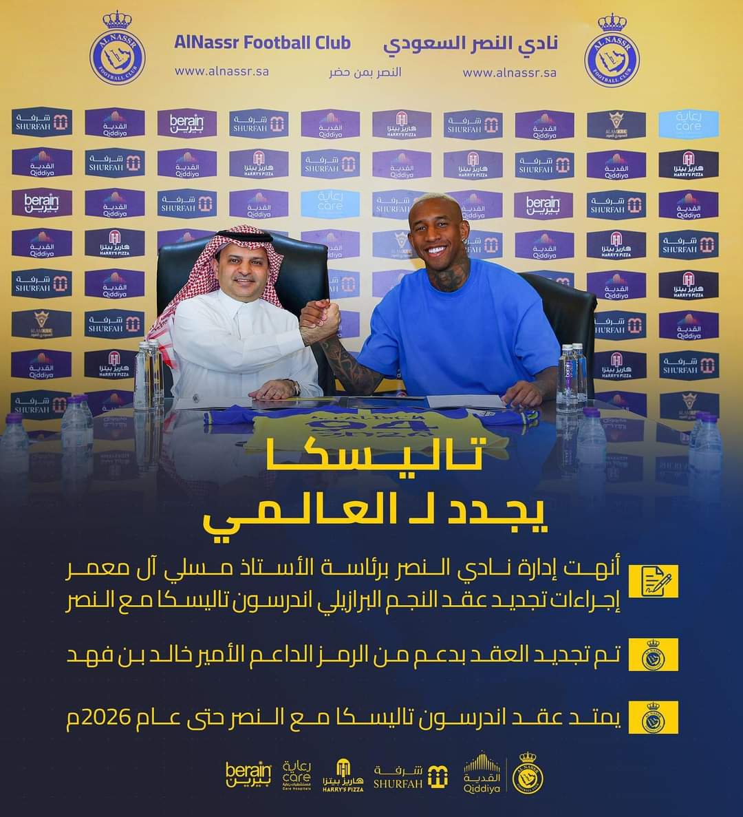 وقال النادي في بيان: تاليسكا يجدد لـ العالمي، حيث أنهت إدارة نادي النصر برئاسة الأستاذ مسلي آل معمر إجراءات تجديد عقد النجم البرازيلي أندرسون تاليسكا مع النصر.