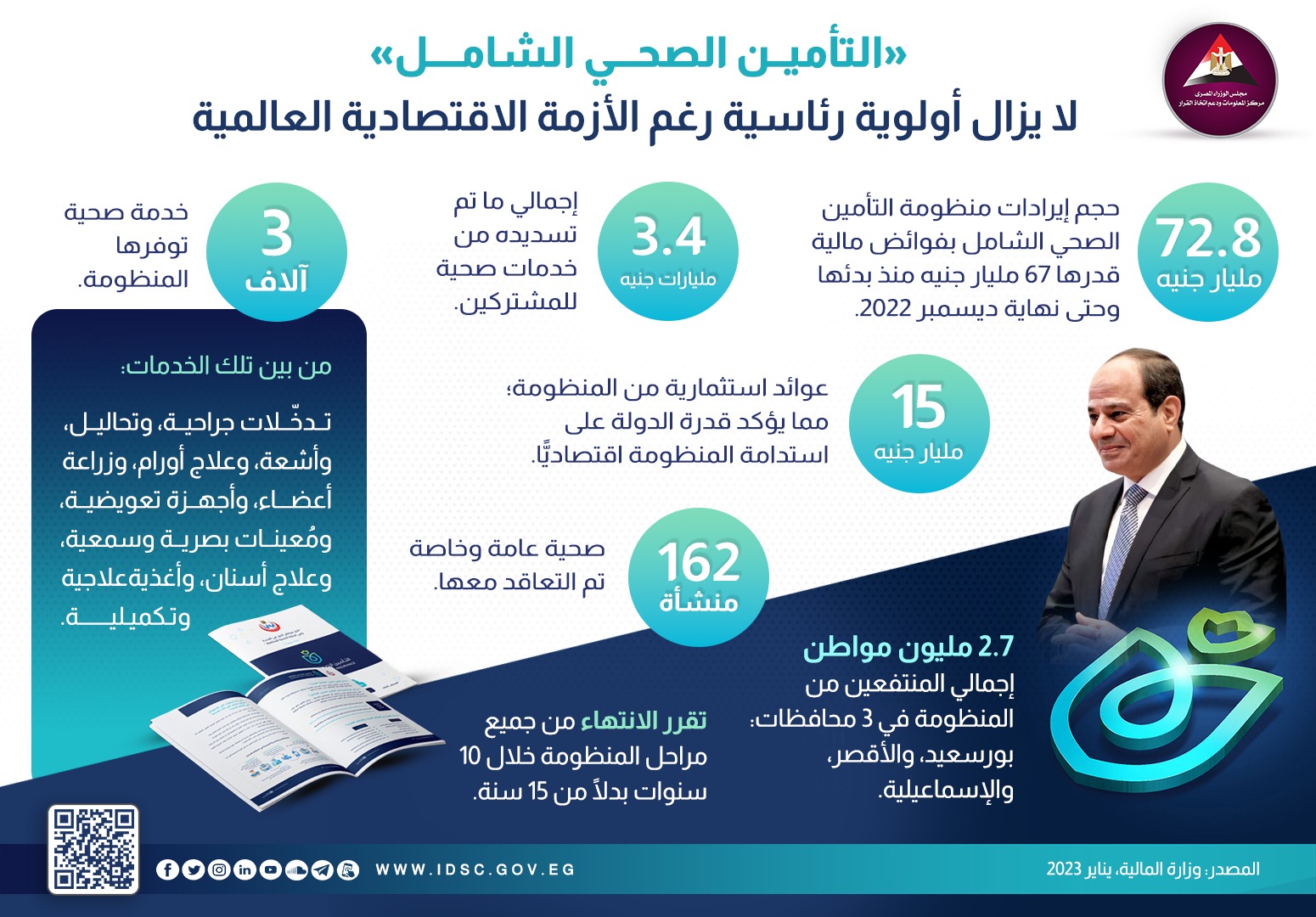 نشر مركز المعلومات ودعم اتخاذ القرار بمجلس الوزراء، انفوجرافا يؤكد أنه على الرغم من الأزمات الاقتصادية العالمية، فإن مصر مستمرة في تطبيق منظومة التأمين الصحي الشامل؛ كونه أحد المحاور الرئيسة لحقوق الإنسان.