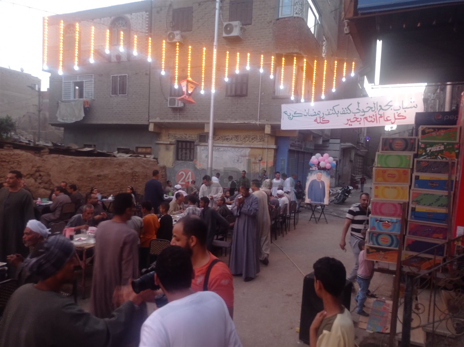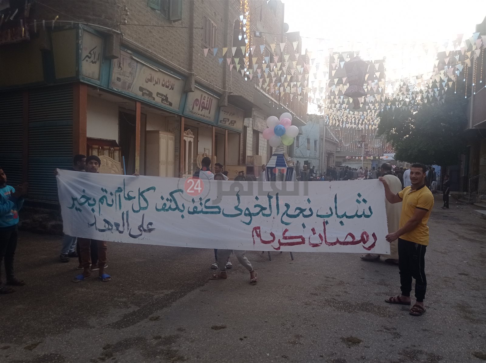 ورغم الظروف الاقتصادية وارتفاع أسعار المكونات الطعام والعصائر، رفع شباب نجع الخولي شعار كتف بكتف، وافترشوا شارع الغنامي بطاولات الطعام على طول الشارع، ورفعوا زينة رمضان في كل مكان ورفعوا لافتات عليها: شباب نجع الخولي كتف بكتف.