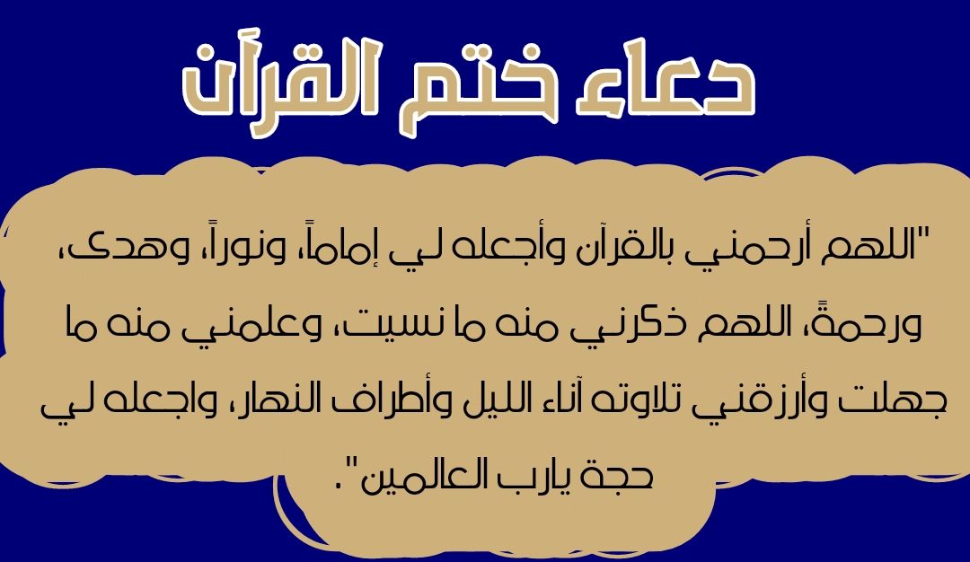 - اللهمّ اجعله لنا شفاءً وهدىً وإمامًا ورحمة، وارزقنا تلاوته على النحو الذي يرضيك عنّا. اللهمّ لا تجعل لنا ذنبًا إلا غفرته، ولا همًّا إلا فرجته، ولا دَينًا إلا قضيته، ولا مريضًا إلا شفيته، ولا عدوًّا إلا كفيته، ولا غائبًا إلا رددته، ولا عاصيًا إلا عصمته، ولا فاسدًا إلا أصلحته، ولا ميّتًا إلا رحمته، ولا عيبًا إلا سترته، ولا عسيرًا إلا يسّرته، ولا حاجةً من حوائج الدنيا والآخرة لك فيها رضًا، ولنا فيها صلاح إلّا أعنتنا على قضائها في يسر منك وعافية برحمتك يا أرحم الرّاحمين. اللهمّ انصر عبادك المجاهدين نصرًا عزيزًا، وافتح لهم فتحًا مبينًا، اللهمّ انفعنا بما علّمتنا، وعلّمنا ما ينفعنا.