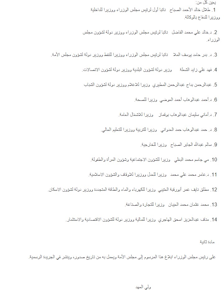 وجاء تشكيل الحكومة الكويتية الجديدة وفقا لما نشرته وكالة الأنباء الرسمية الكويتية كما هو موضح بالصورة أدناه: