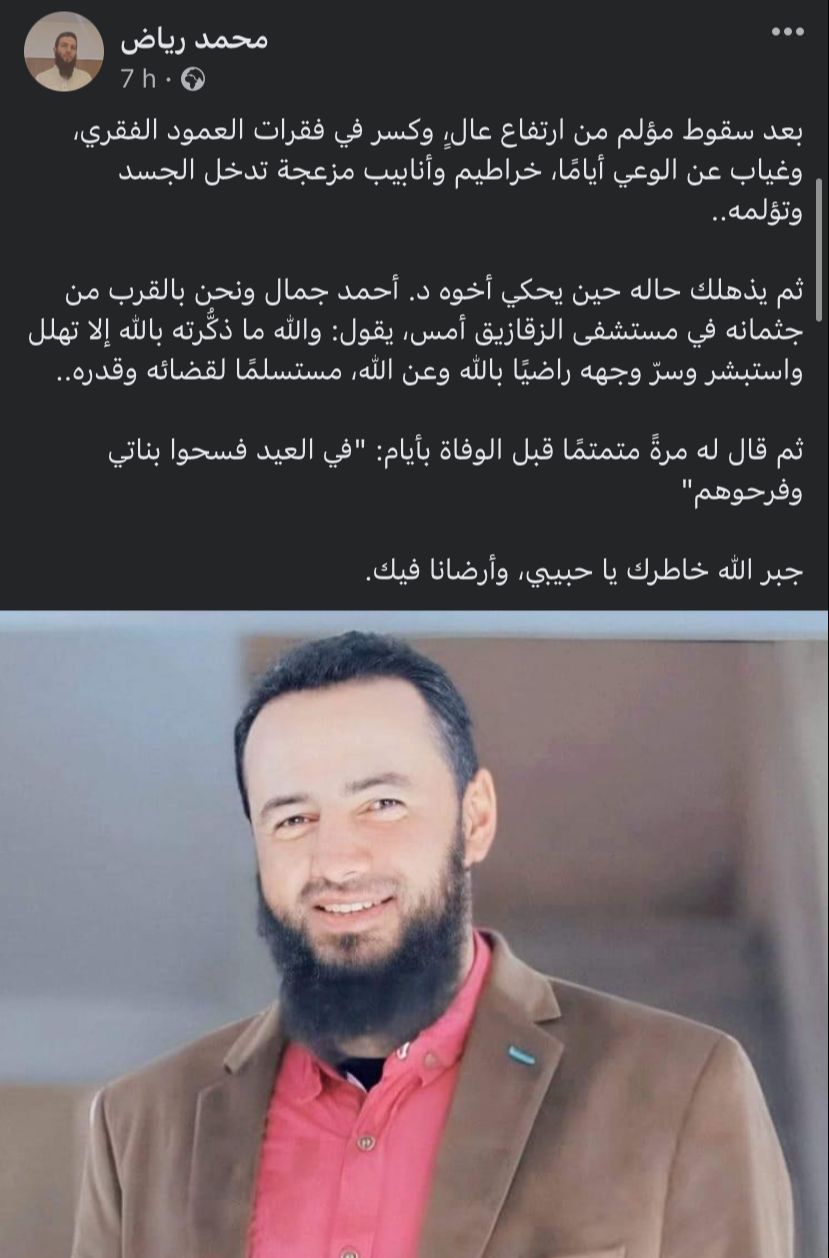 وكتب محمد رياض، أحد أصدقاء الشيخ محمد جمال، في منشور له عبر تطبيق فيسبوك: بعد سقوط مؤلم من ارتفاع عال، وكسر في فقرات العمود الفقري، وغياب عن الوعي أيامًا، وخراطيم وأنابيب مزعجة تدخل الجسد وتؤلمه، قال لشقيقه متمتمًا قبل الوفاة بأيام: في العيد فسحوا بناتي وفرحوهم.. جبر الله خاطرك يا حبيبي، وأرضانا فيك.