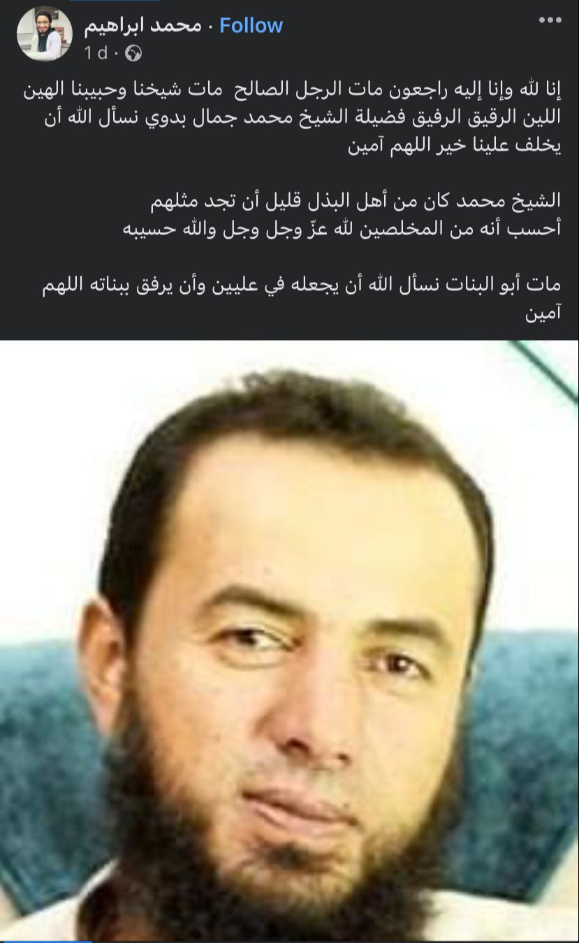 وقال محمد إبراهيم، في منشور له، إنا لله وإنا إليه راجعون مات الرجل الصالح.. مات شيخنا وحبيبنا الهين اللين الرقيق الرفيق فضيلة الشيخ محمد جمال بدوي، نسأل الله أن يخلف علينا خير اللهم آمين.