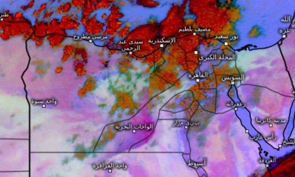 وأشارت هيئة الأرصاد الجوية إلى وجود سحب الرعدية تحكم سيطرتها على السواحل الشمالية الغربية وشمال الوجه البحري، والذي يصاحبها سقوط أمطار متوسطة الشدة تكون غزيرة أحيانا مع تقدم الوقت كما يصاحبها أيضا تساقط لحبات البرد، كما تمتد الأمطار الرعدية على غرب الدلتا الغربية ومحافظتي المنوفية والقليوبية.