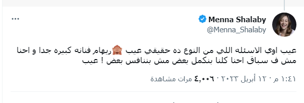 واستاءت منة شلبي من مقارنتها بريهام عبد الغفور، وكتبت عبر حسابها بموقع تويتر: عيب أوي الأسئلة اللي من النوع ده حقيقي عيب ريهام فنانة كبيرة جدا وإحنا مش في سباق احنا كلنا بنكمل بعض مش بننافس بعض عيب.