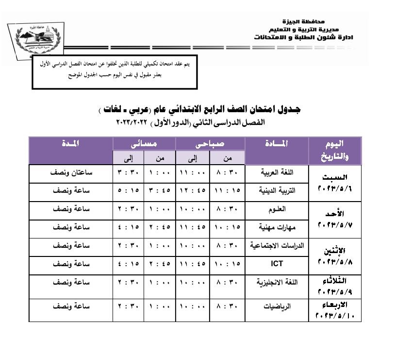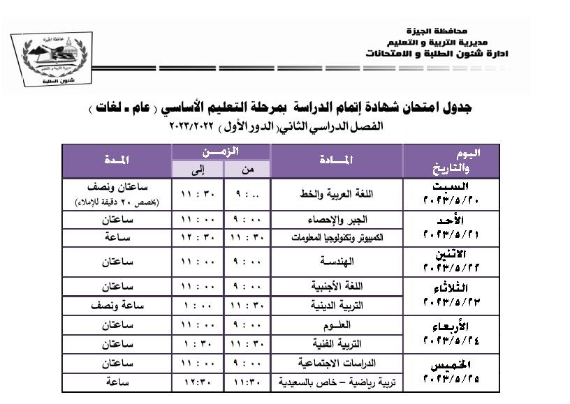 اعتمد اللواء أحمد راشد محافظ الجيزة، وأشرف سلومة وكيل وزارة التربية والتعليم بالجيزة، مواعيد امتحانات الفصل الدراسي الثانى الدور الأول أخر العام للعام الدراسي 2022/2023، وفقًا للمواعيد التالية: -
