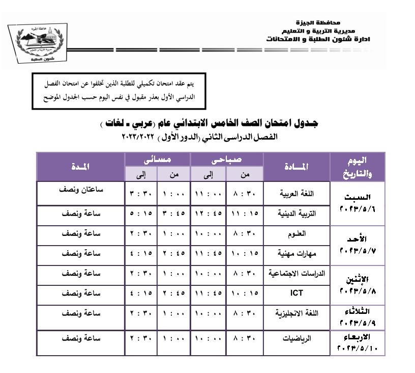 بدءًا من 6 مايو.. ننشر جداول امتحانات الدور الأول للترم الثاني 2023 بالجيزة