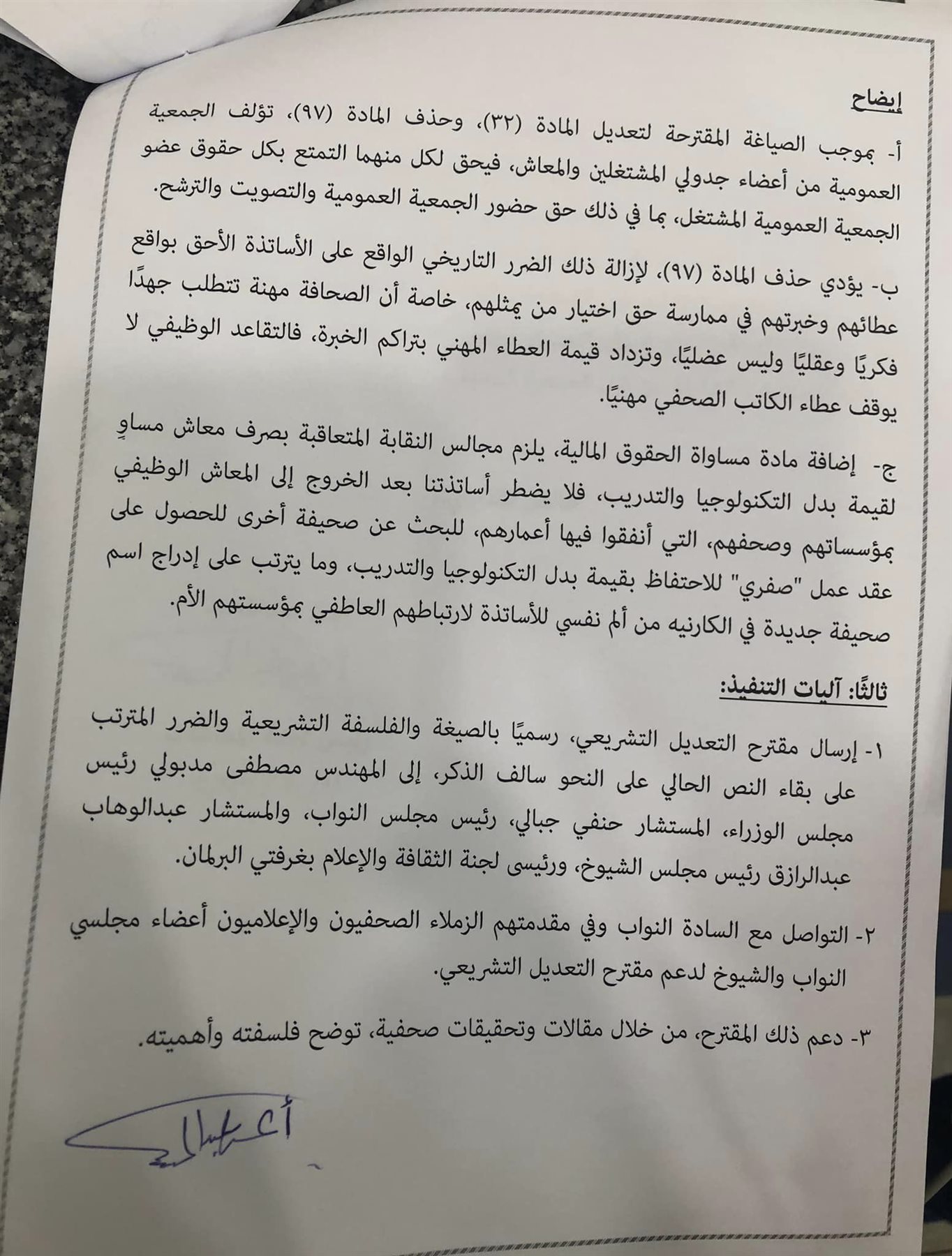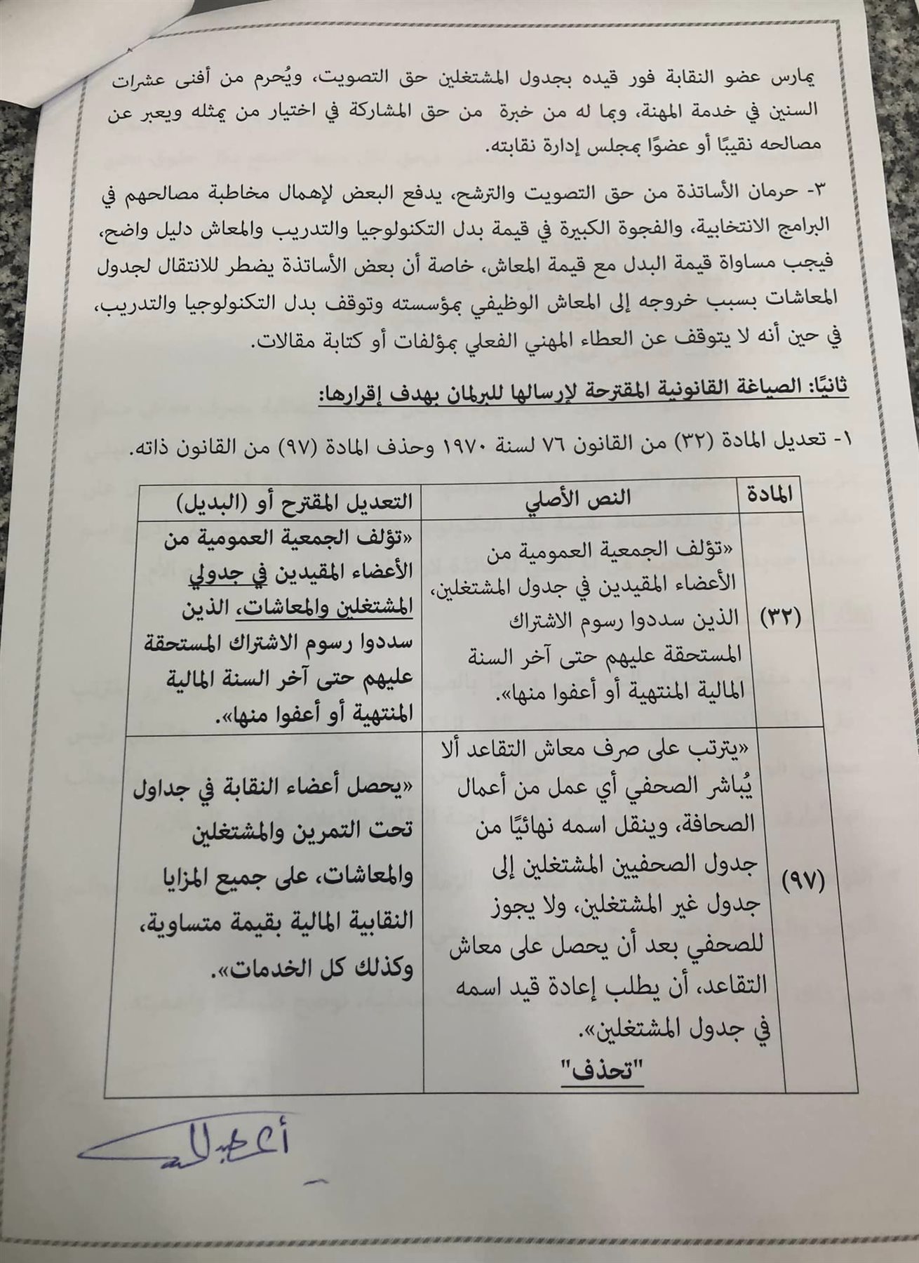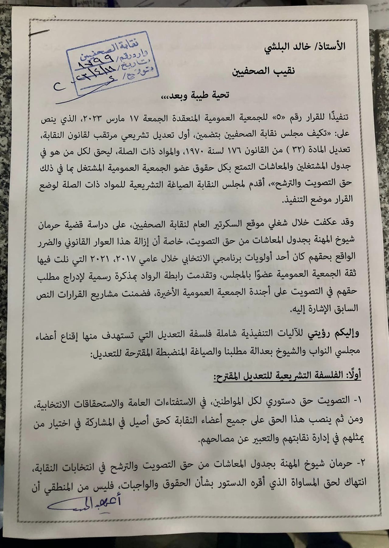 وأضاف رئيس لجنة المعاشات خلال النص المقترح المقدم كالتالي: تنفيذًا للقرار رقم «5» للجمعية العمومية المنعقدة الجمعة 17 مارس 2023، الذي ينص على: «تكيف مجلس نقابة الصحفيين بتضمين، أول تعديل تشريعي مرتقب لقانون النقابة، تعديل المادة (32 )من القانون 176 لسنة 1970، والمواد ذات الصلة، ليحق لكل من هو في جدول المشتغلين والمعاشات التمتع بكل حقوق عضو الجمعية العمومية المشتغل بما في ذلك حق التصويت والترشح»، أقدم لمجلس النقابة الصياغة التشريعية للمواد ذات الصلة لوضع القرار موضع التنفيذ.