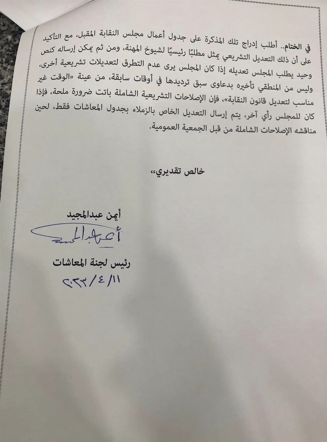تقدم أيمن عبد المجيد رئيس لجنة المعاشات بـ نقابة الصحفيين، بمقترح تعديل تشريعي لقانون النقابة، إلى مجلس النقابة، ليحق لكل من هو في جدول المشتغلين والمعاشات التمتع بكل حقوق عضو الجمعية العمومية المشتغل بما في ذلك حق التصويت والترشح، كذلك مساواة قيمة البدل بالمعاش.