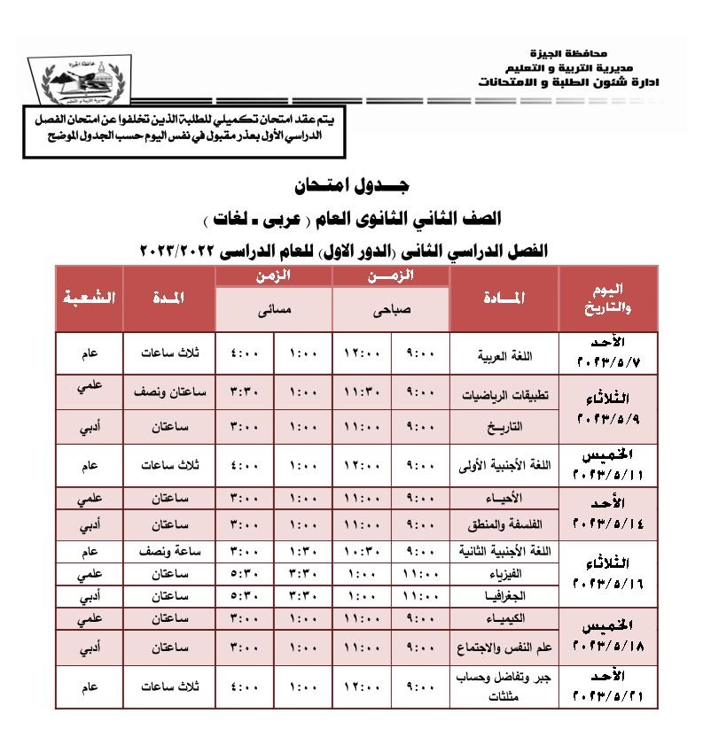 جدول امتحانات الصف الثاني الثانوي الترم الثاني 2023 بالجيزة