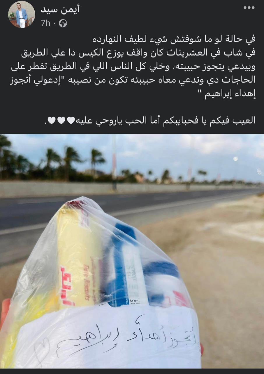 وكتب أيمن السيد على صفحته الشخصية على فيس بوك، في حالة لو ماشوفتش شيء لطيف النهاردة، فيه شاب في العشرينات كان واقف يوزع الكيس دا على الطريق، وبيدعي يتجوز حبيبته.