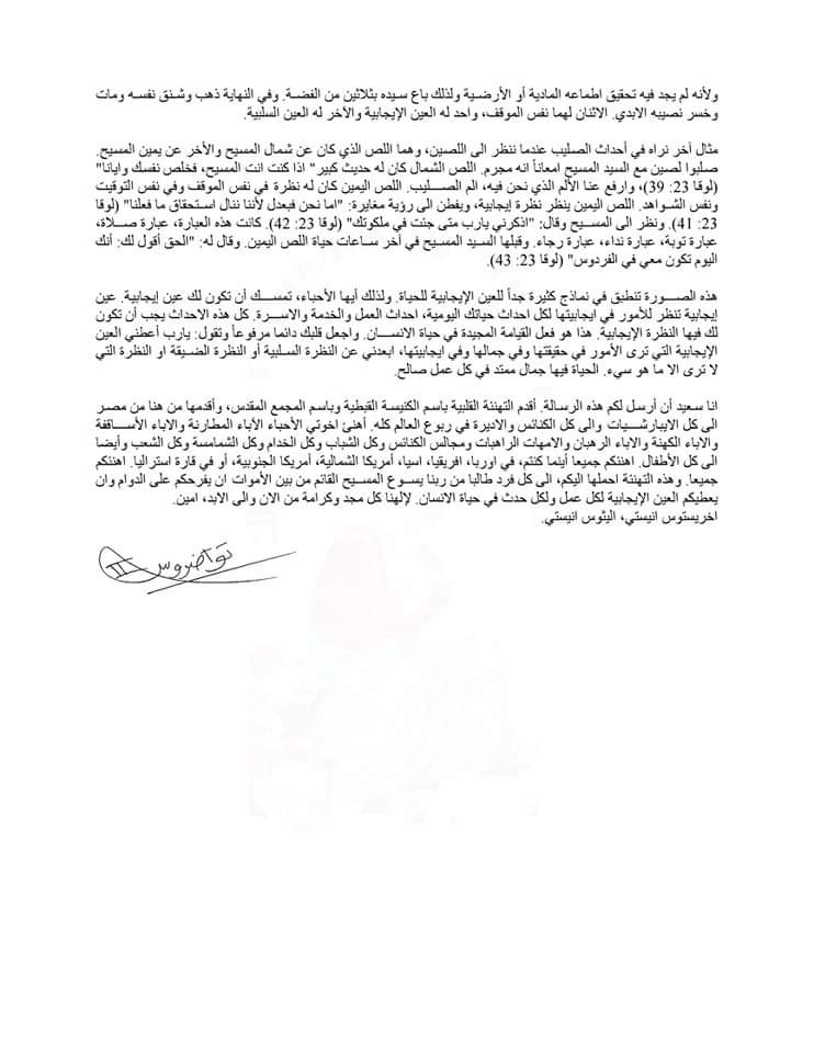 واختتم البابا تواضروس، أنا سعيد أن أرسل لكم هذه الرسالة أقدم التهنئة القلبية باسم الكنيسة القبطية وباسم المجمع المقدس، وأقدمها من هنا من مصر الى كل الإيبارشيات والى كل الكنائس والأديرة في ربوع العالم كله أهنئ اخوتي الأحباء الأباء المطارنة والاباء الأساقفة والأباء الكهنة والآباء الرهبان والأمهات الراهبات ومجالس الكنائس وكل الشباب وكل الخدام وكل الشمامسة وكل الشعب وأيضا الى كل الأطفال. اهنئكم جميعا أينما كنتم في أوربا، افريقيا اسيا أمريكا الشمالية، أمريكا الجنوبية، أو في قارة استراليا. اهنئكم جميعا. وهذه التهنئة احملها اليكم إلى كل فرد طالبا من ربنا يسوع المسيح القائم من بين الأموات أن يفرحكم على الدوام وأن يعطيكم العين الإيجابية لكل عمل ولكل حدث في حياة الانسان لإلهنا كل مجد وكرامة من الآن والى الأبد، امين آخريستوس انيستي، اليسوس انيستي..