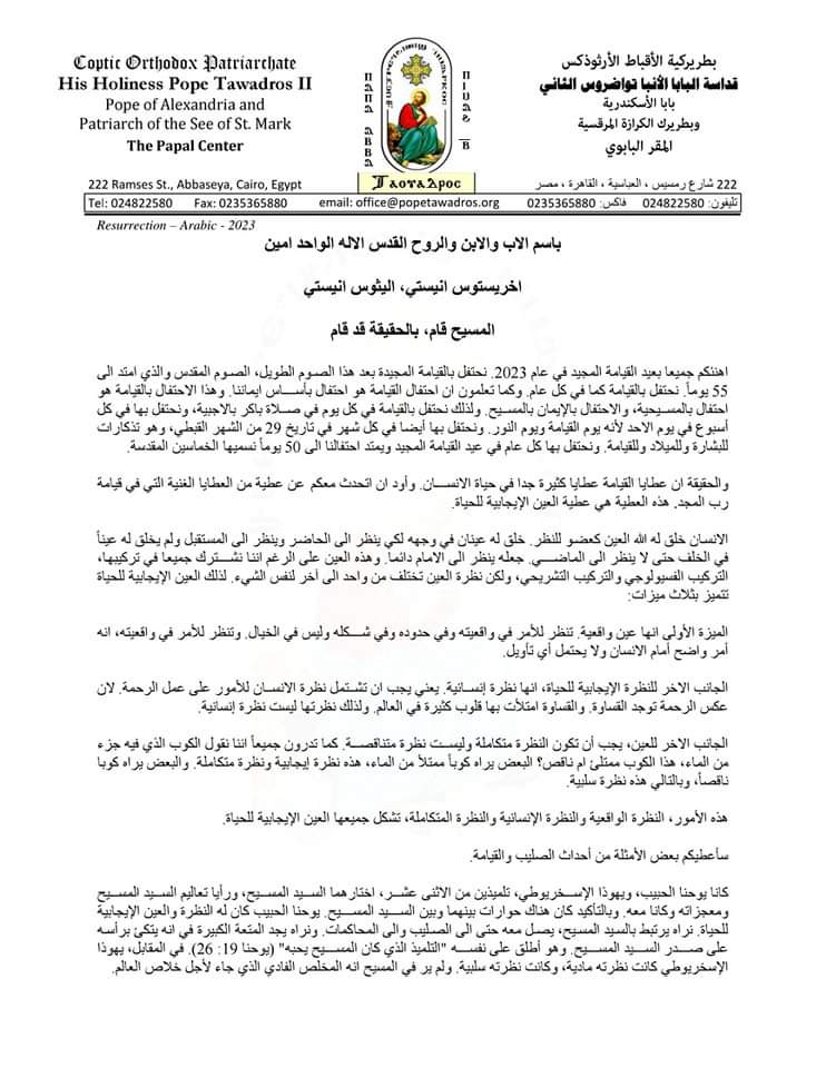 وقال البابا تواضروس الثاني في رسالته البابوية، أهنئكم جميعا بعيد القيامة المجيد في عام 2023 نحتفل بالقيامة المجيدة بعد هذا الصوم الطويل، الصوم المقدس والذي امتد إلى 55 يومًا تحتفل بالقيامة كما في كل عام، وكما تعلمون أن ن احتفال القيامة هو احتفال بأساس إيماننا وهذا الاحتفال بالقيامة هو احتفال بالمسيحية، والاحتفال بالإيمان بالمسيح. ولذلك نحتفل بالقيامة في كل يوم في صلاة باكر بالأجبية، وتحتفل بها في كل أسبوع في يوم الاحد لأنه يوم القيامة ويوم النور ونحتفل بها أيضا في كل شهر في تاريخ 29 من الشهر القبطي، وهو تذكارات للبشارة وللميلاد والقيامة. ونحتفل بها كل عام في عيد القيامة المجيد ويمتد احتفالنا الى 50 يوما تسميها الخماسين المقدسة.