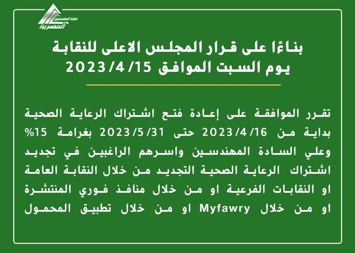 أصدر المجلس الأعلى لـ نقابة المهندسين، قرارا بالموافقة على فتح اشتراك الرعاية الصحية بداية من 2023/4/16 حتى 2023/5/31 بغرامة 15%.