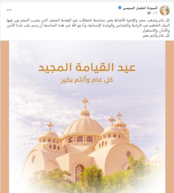 وقالت السيدة انتصار السيسي، في منشور لها، عبر صفحتها الرسمية بموقع التواصل الاجتماعي فيس بوك: كل عام وشعب مصر والإخوة الأقباط بخير، بمناسبة احتفالات عيد القيامة المجيد، التي يضرب المصريون فيها المثل العظيم في الترابط والتضامن والوحدة الإنسانية، وأدعو الله في هذه المناسبة أن يديم على بلدنا الأمن والأمان والاستقرار.. كل عام وأنتم بخير.